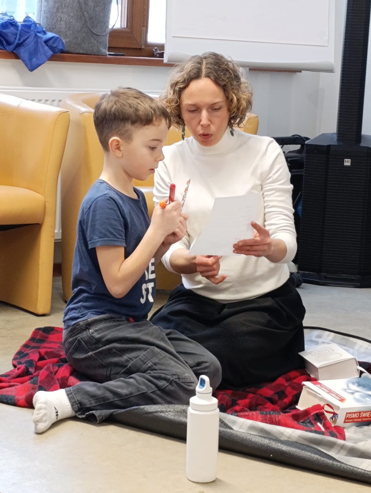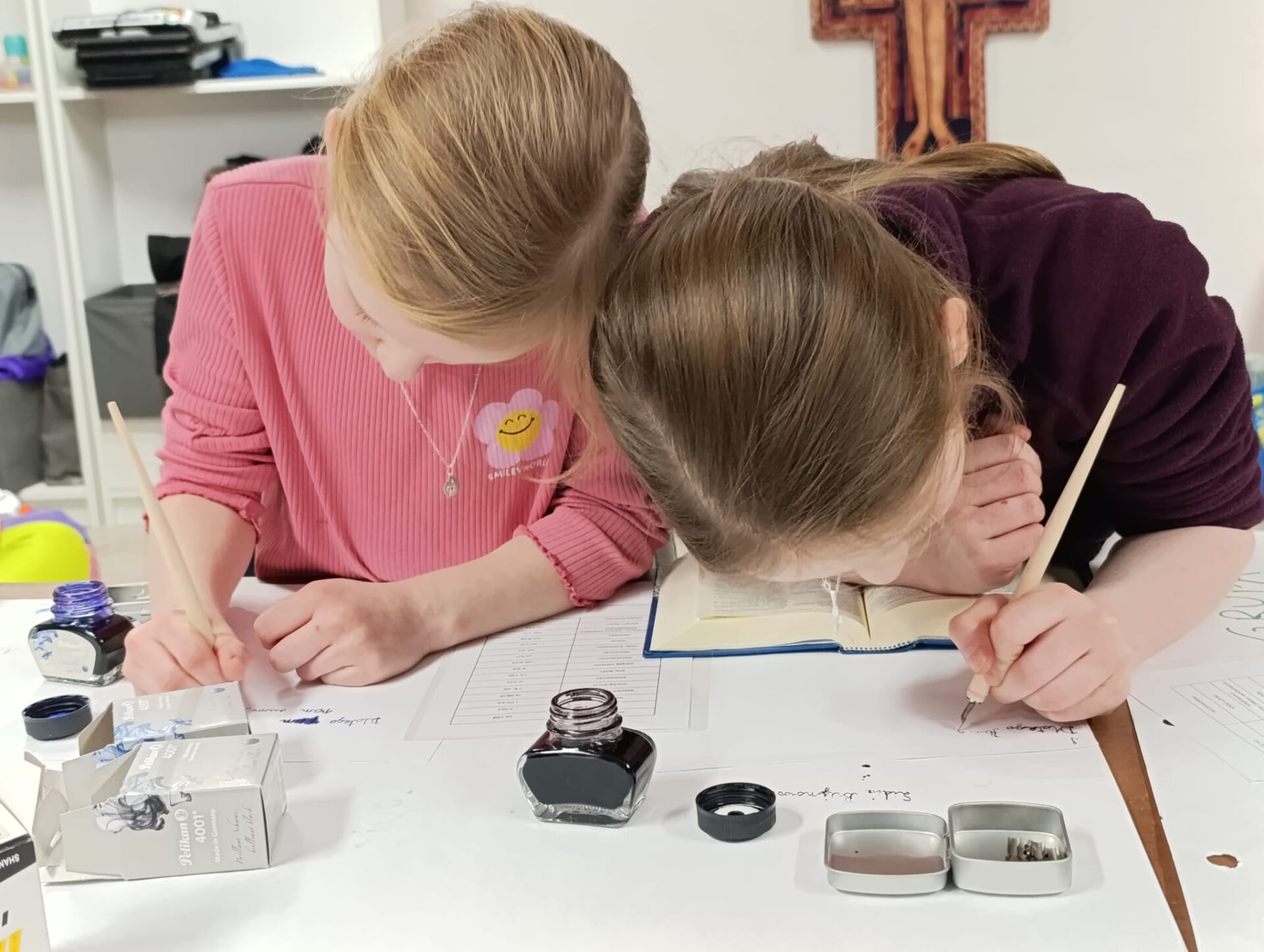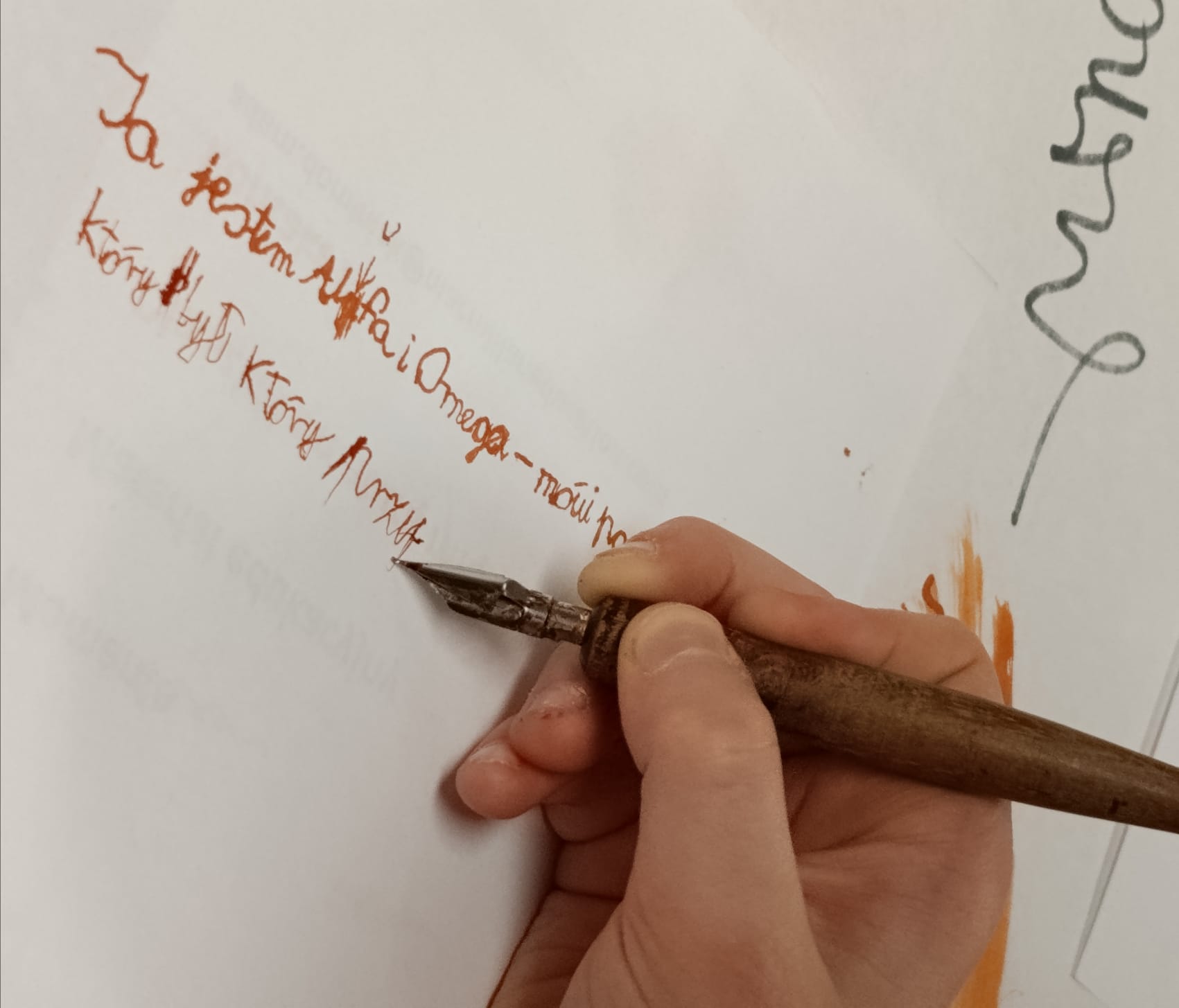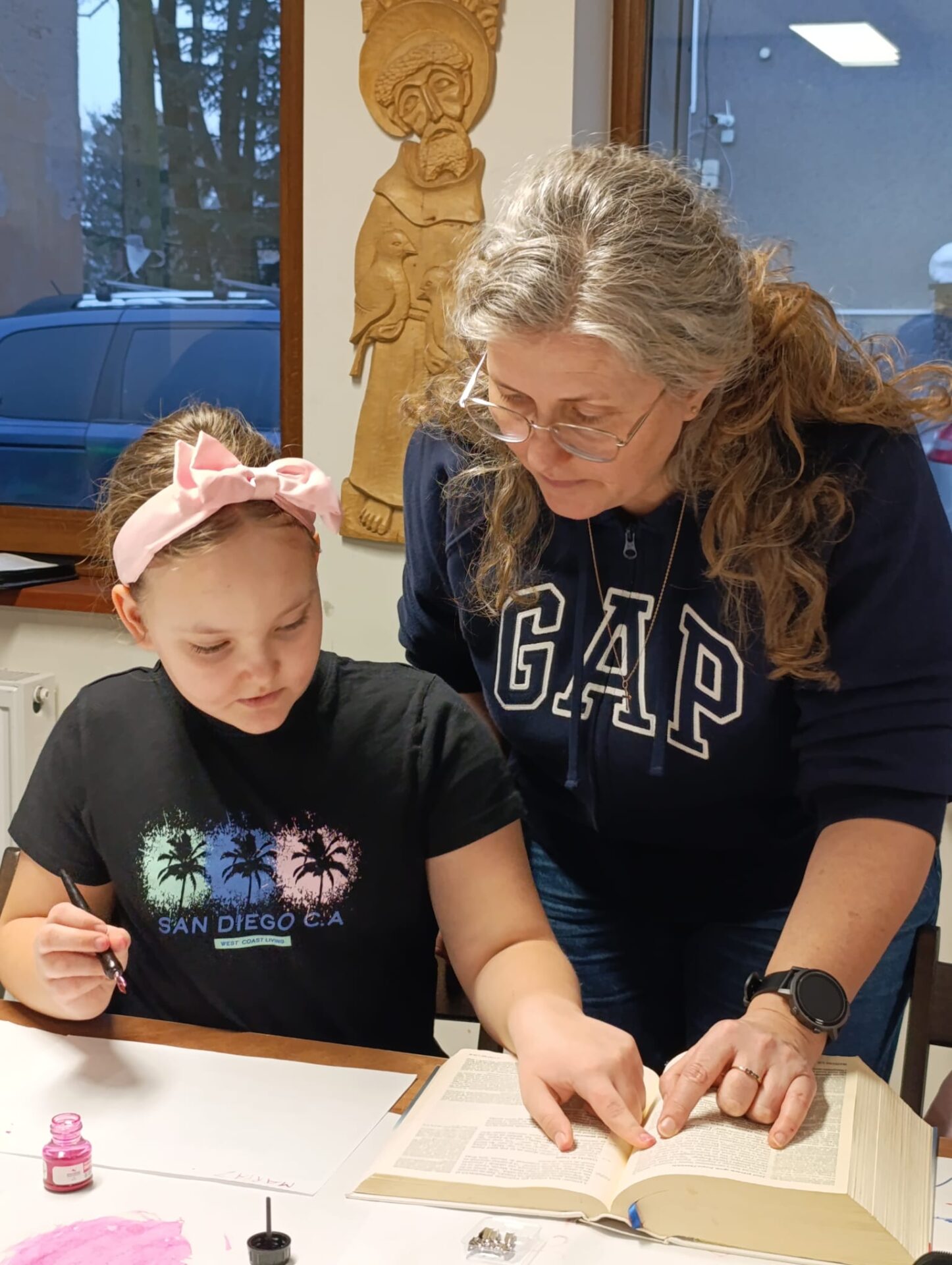 Motywem przewodnim naszego spotkania było Pismo Święte. Poznawaliśmy jego historię, niezwykłą liczbę tłumaczeń i wersji tej samej Prawdy. Nauczyliśmy się rozszyfrowywać biblijne sigla, odszukiwać wybrane fragmenty w tym przeogromnym gąszczu słów. Następnie Baranki, wzorem niegdysiejszych skrybów, przy kojących dźwiękach pieśni Jeszua zagłębiały się święte słowa Ewangelii. Poprzez uprawianie tradycyjnej sztuki kaligrafii tak się zajęły fragmentami Pisma, że rodzice mogli mieć chwilę na osobną medytację, spacer lub po prostu swój czas.