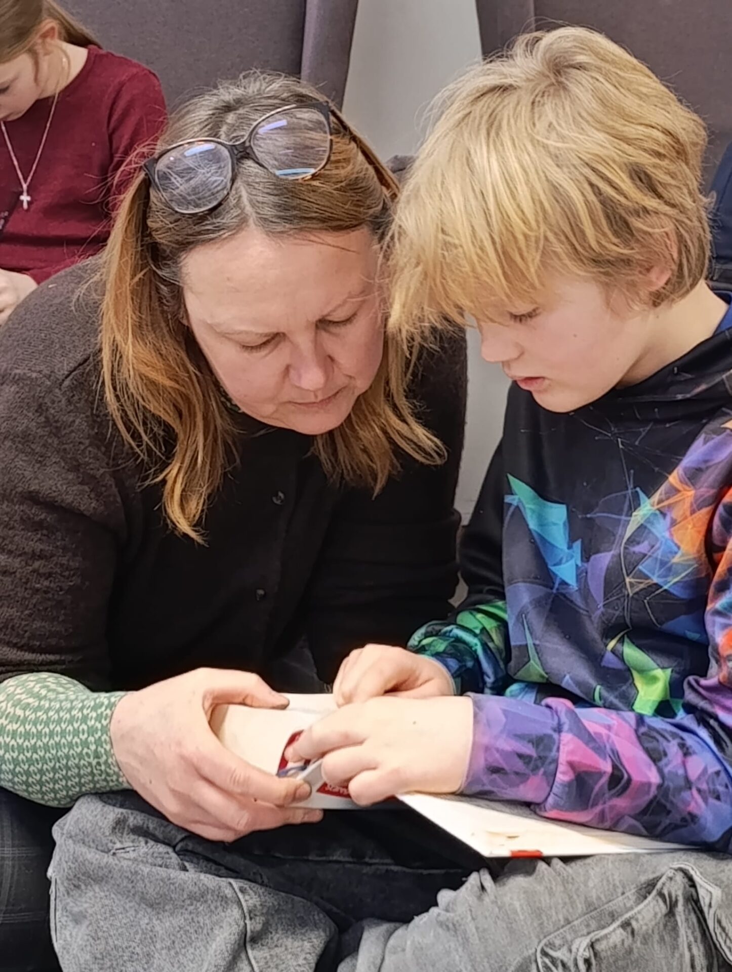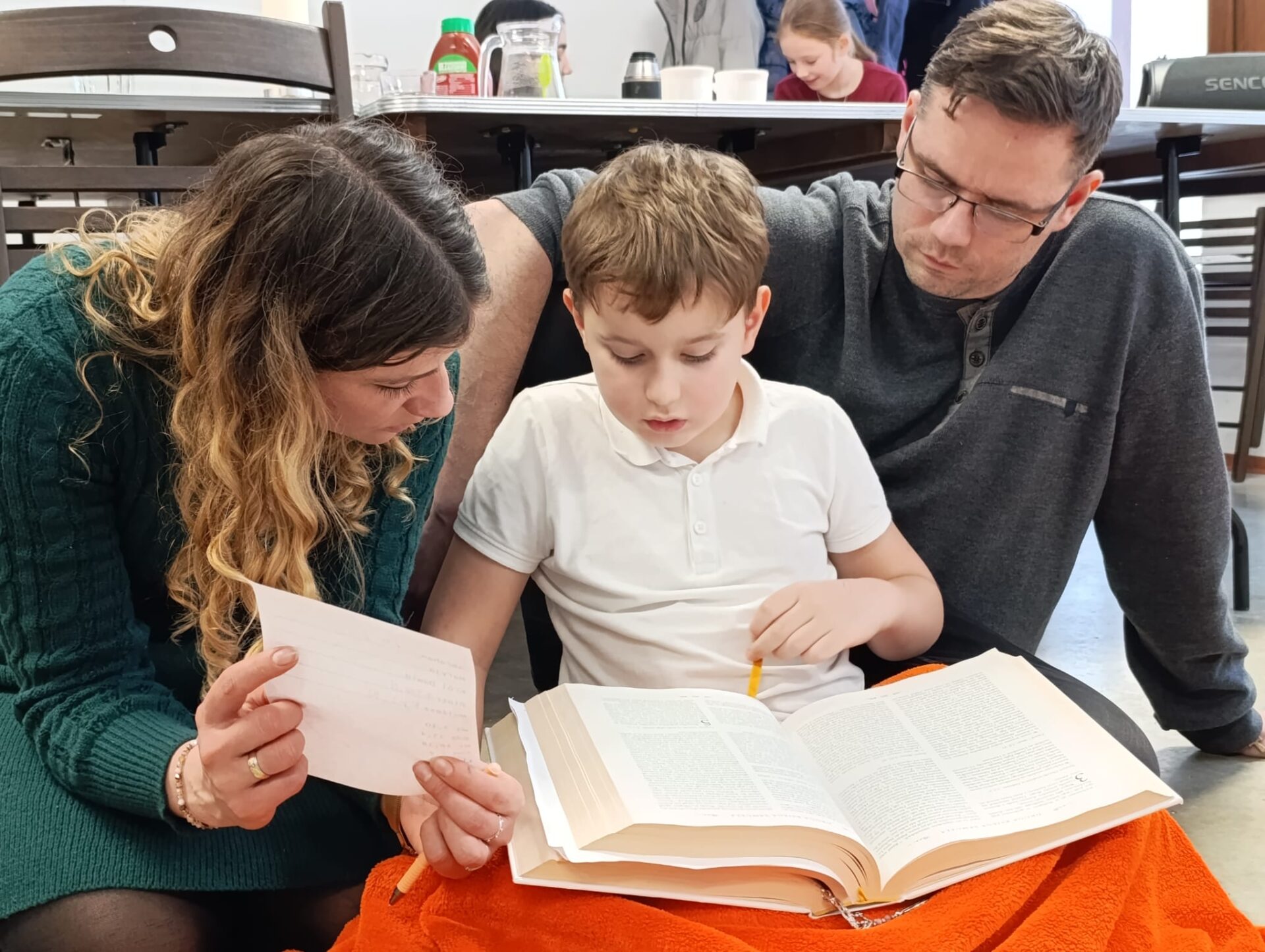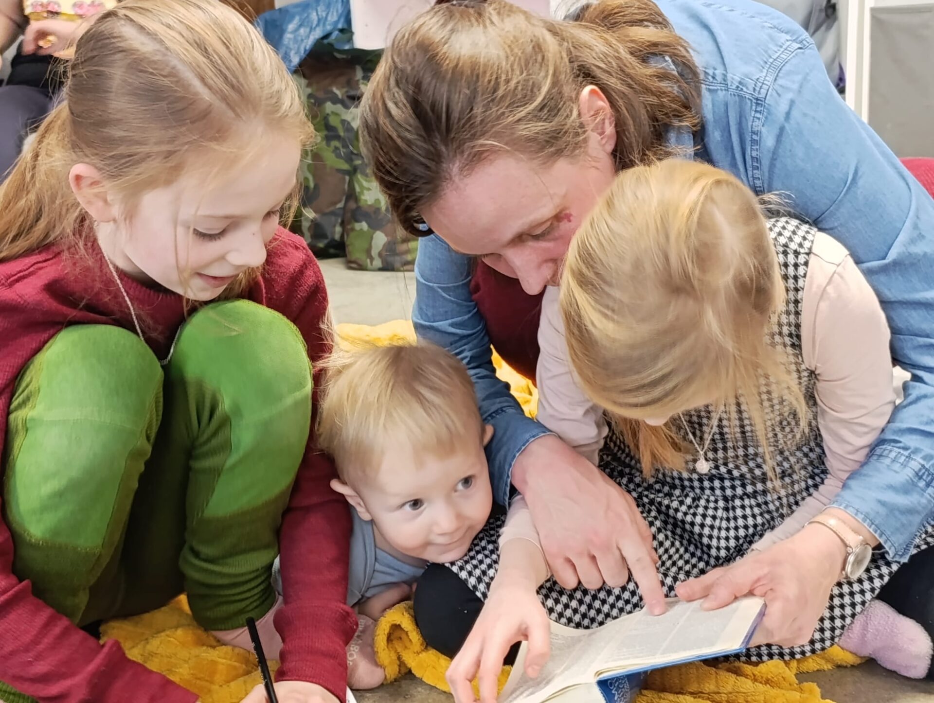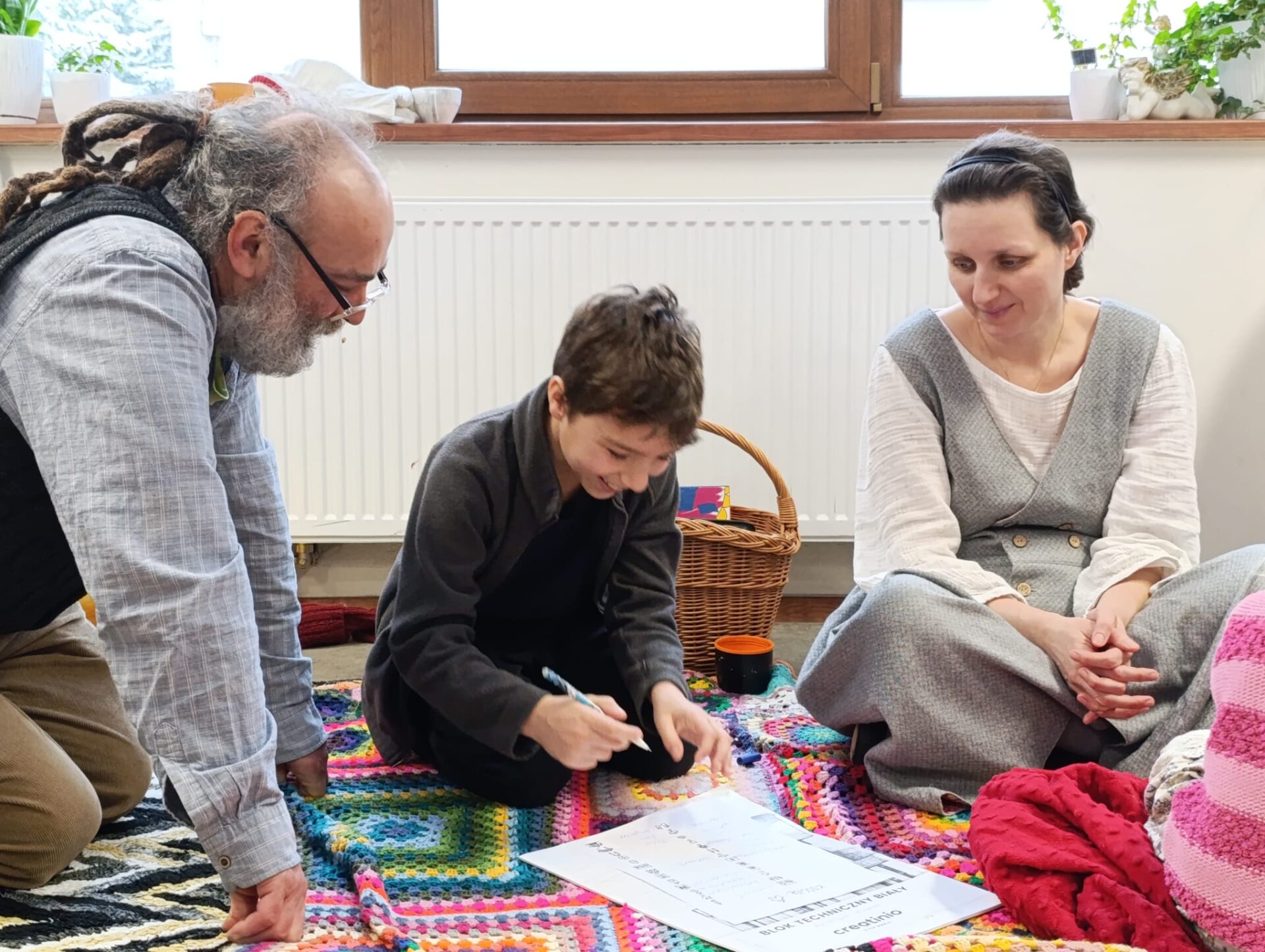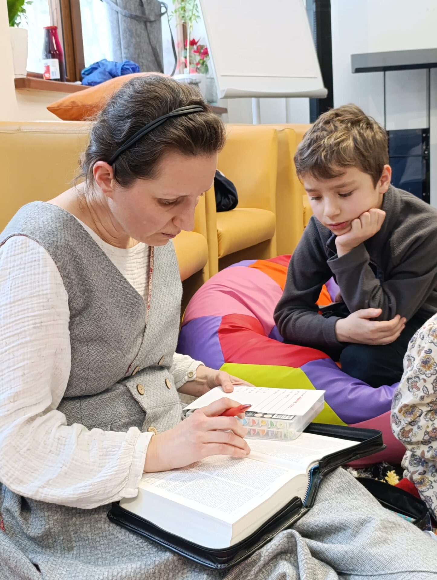 Motywem przewodnim naszego spotkania było Pismo Święte. Poznawaliśmy jego historię, niezwykłą liczbę tłumaczeń i wersji tej samej Prawdy. Nauczyliśmy się rozszyfrowywać biblijne sigla, odszukiwać wybrane fragmenty w tym przeogromnym gąszczu słów. Następnie Baranki, wzorem niegdysiejszych skrybów, przy kojących dźwiękach pieśni Jeszua zagłębiały się święte słowa Ewangelii. Poprzez uprawianie tradycyjnej sztuki kaligrafii tak się zajęły fragmentami Pisma, że rodzice mogli mieć chwilę na osobną medytację, spacer lub po prostu swój czas.